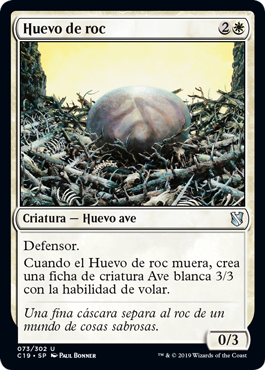 | Rules | Defender (This creature can't attack.) When Roc Egg dies, create a 3/3 white Bird creature token with flying. |