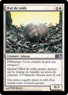 | Rules | Defender (This creature can't attack.) When Roc Egg dies, create a 3/3 white Bird creature token with flying. |