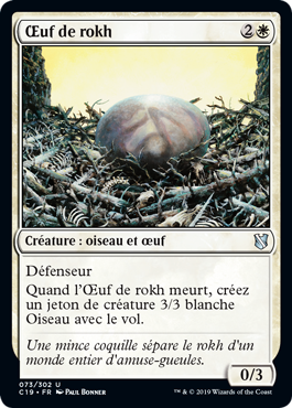 | Rules | Defender (This creature can't attack.) When Roc Egg dies, create a 3/3 white Bird creature token with flying. |