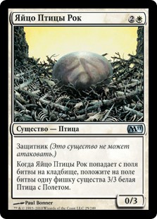 | Rules | Defender (This creature can't attack.) When Roc Egg dies, create a 3/3 white Bird creature token with flying. |