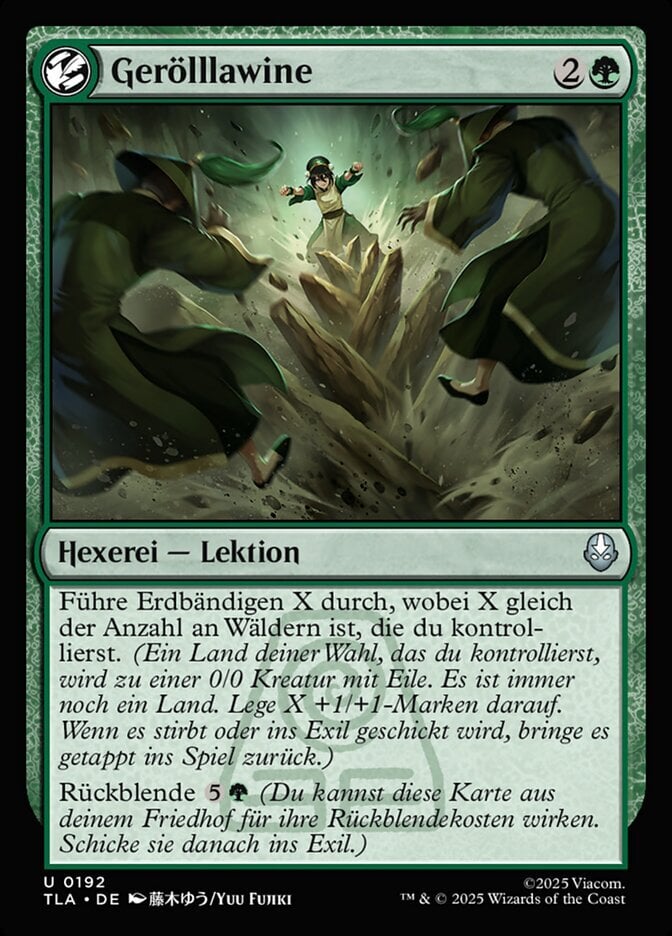 | Rules | Earthbend X, where X is the number of Forests you control. (Target land you control becomes a 0/0 creature with haste that's still a land. Put X +1/+1 counters on it. When it dies or is exiled, return it to the battlefield tapped.) Flashback (You may cast this card from your graveyard for its flashback cost. Then exile it.) |