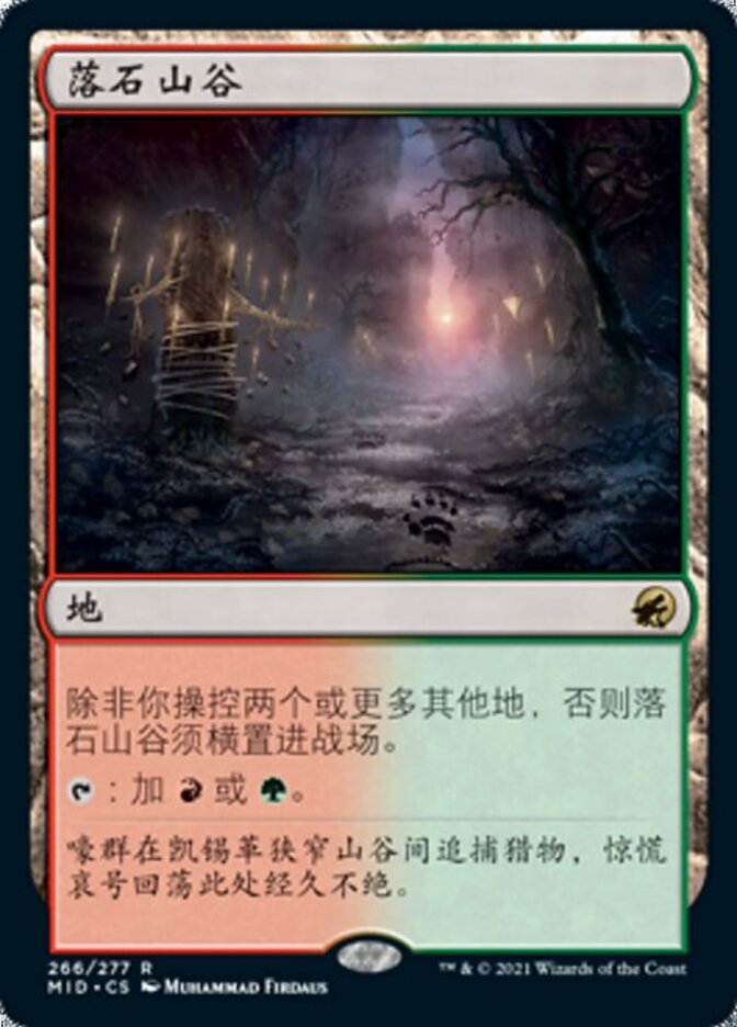 | Rules | Rockfall Vale enters the battlefield tapped unless you control two or more other lands. : Add or . |