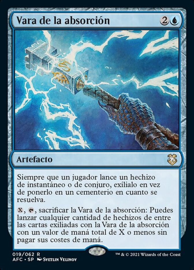 | Rules | Whenever a player casts an instant or sorcery spell, exile it instead of putting it into a graveyard as it resolves. , , Sacrifice Rod of Absorption: You may cast any number of spells from among cards exiled with Rod of Absorption with total mana value X or less without paying their mana costs. |