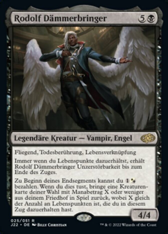 | Rules | Flying, deathtouch, lifelink Whenever you gain life, Rodolf Duskbringer gains indestructible until end of turn. At the beginning of your end step, you may pay . When you do, return target creature with mana value X or less from your graveyard to the battlefield, where X is the amount of life you gained this turn. |