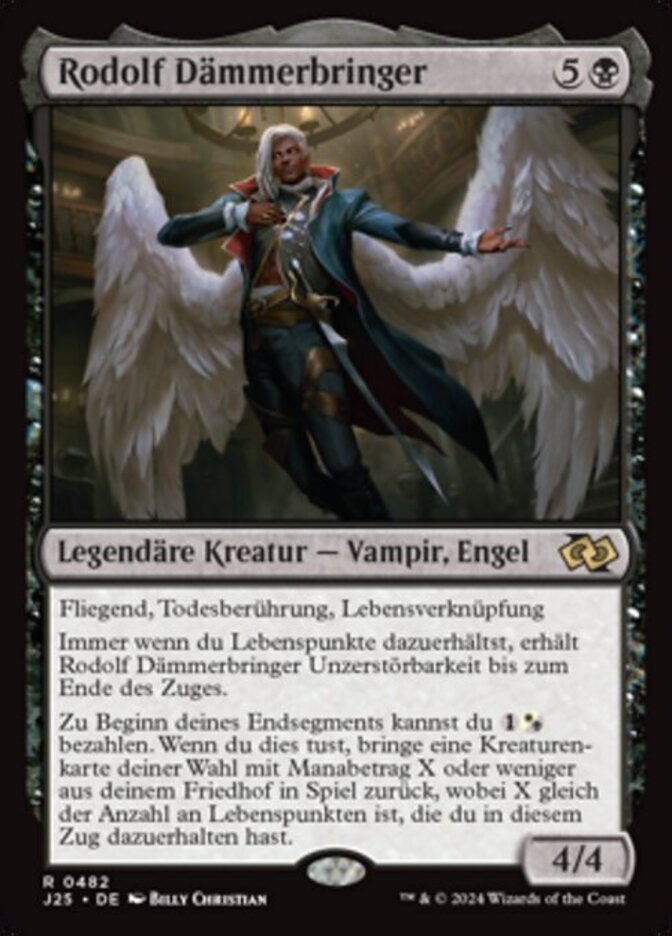 | Rules | Flying, deathtouch, lifelink Whenever you gain life, Rodolf Duskbringer gains indestructible until end of turn. At the beginning of your end step, you may pay . When you do, return target creature with mana value X or less from your graveyard to the battlefield, where X is the amount of life you gained this turn. |