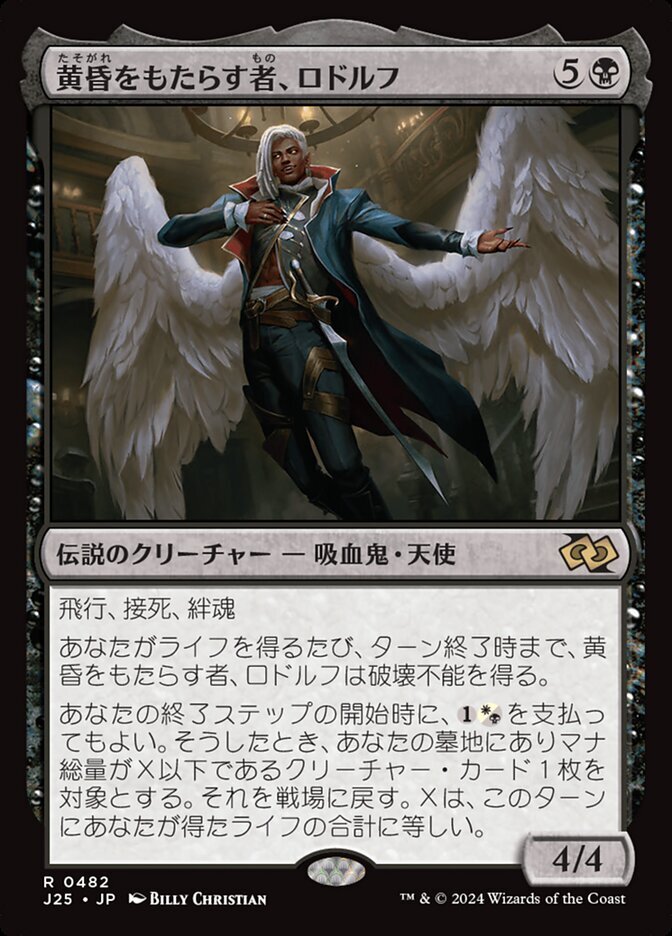 | Rules | Flying, deathtouch, lifelink Whenever you gain life, Rodolf Duskbringer gains indestructible until end of turn. At the beginning of your end step, you may pay . When you do, return target creature with mana value X or less from your graveyard to the battlefield, where X is the amount of life you gained this turn. |