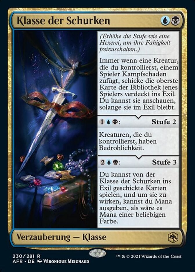 | Rules | (Gain the next level as a sorcery to add its ability.) Whenever a creature you control deals combat damage to a player, exile the top card of that player's library face down. You may look at it for as long as it remains exiled. : Level 2 Creatures you control have menace. : Level 3 You may play cards exiled with Rogue Class, and you may spend mana as though it were mana of any color to cast those spells. |