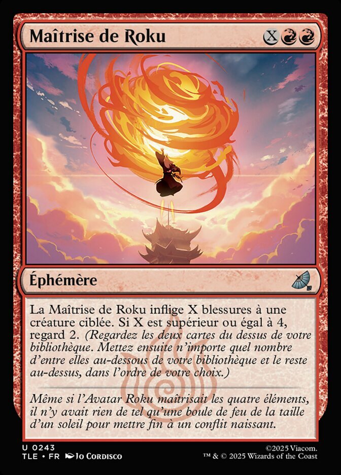 | Rules | Roku's Mastery deals X damage to target creature. If X is 4 or greater, scry 2. (Look at the top two cards of your library, then put any number of them on the bottom and the rest on top in any order.) |