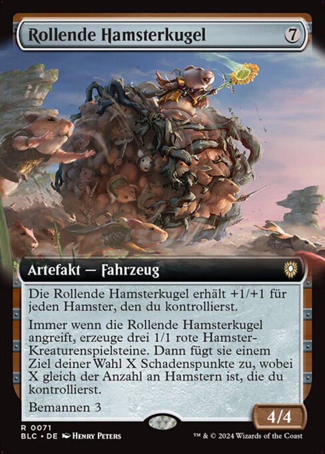 | Rules | Rolling Hamsphere gets +1/+1 for each Hamster you control. Whenever Rolling Hamsphere attacks, create three 1/1 red Hamster creature tokens, then it deals X damage to any target, where X is the number of Hamsters you control. Crew 3 |