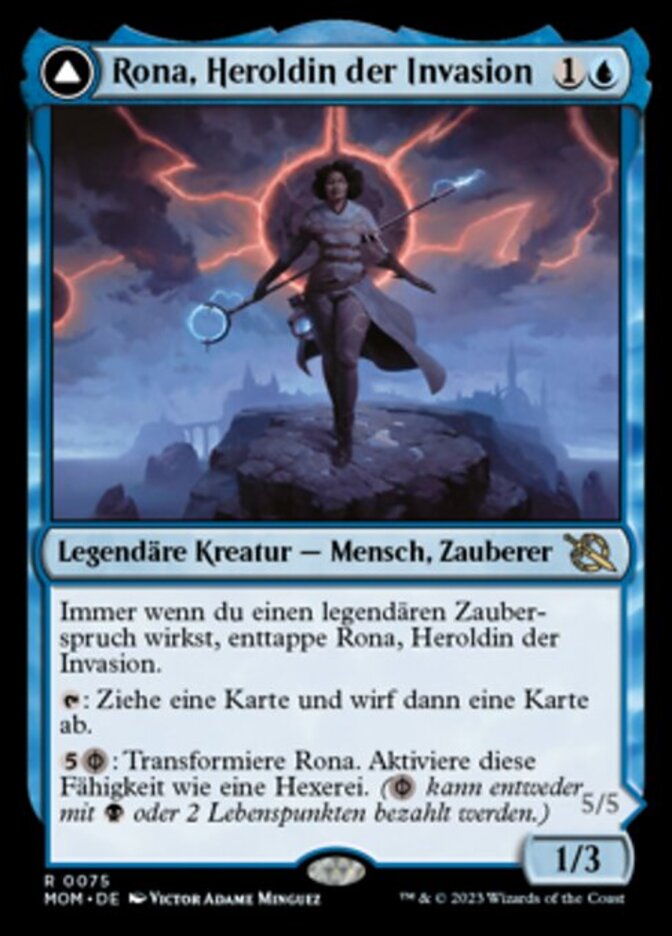 | Rules | Whenever you cast a legendary spell, untap Rona, Herald of Invasion. : Draw a card, then discard a card. : Transform Rona. Activate only as a sorcery. ( can be paid with either or 2 life.) // Trample Whenever a source deals damage to Rona, Tolarian Obliterator, that source's controller exiles a card from their hand at random. If it's a land card, you may put it onto the battlefield under your control. Otherwise, you may cast it without paying its mana cost. |