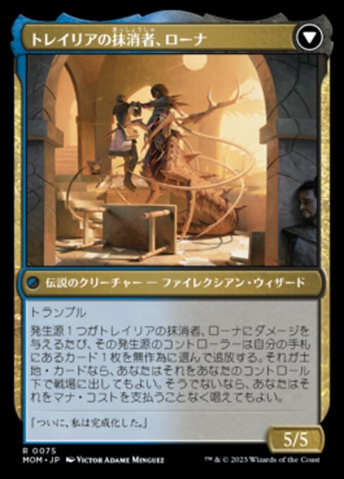 | Rules | Whenever you cast a legendary spell, untap Rona, Herald of Invasion. : Draw a card, then discard a card. : Transform Rona. Activate only as a sorcery. ( can be paid with either or 2 life.) // Trample Whenever a source deals damage to Rona, Tolarian Obliterator, that source's controller exiles a card from their hand at random. If it's a land card, you may put it onto the battlefield under your control. Otherwise, you may cast it without paying its mana cost. |
