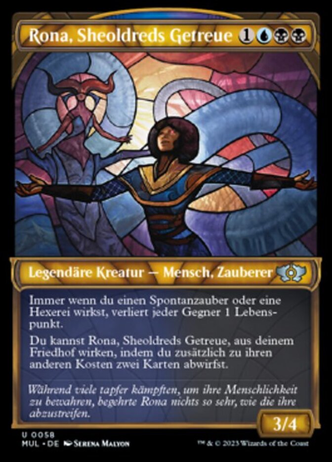 | Rules | Whenever you cast an instant or sorcery spell, each opponent loses 1 life. You may cast Rona, Sheoldred's Faithful from your graveyard by discarding two cards in addition to paying its other costs. |