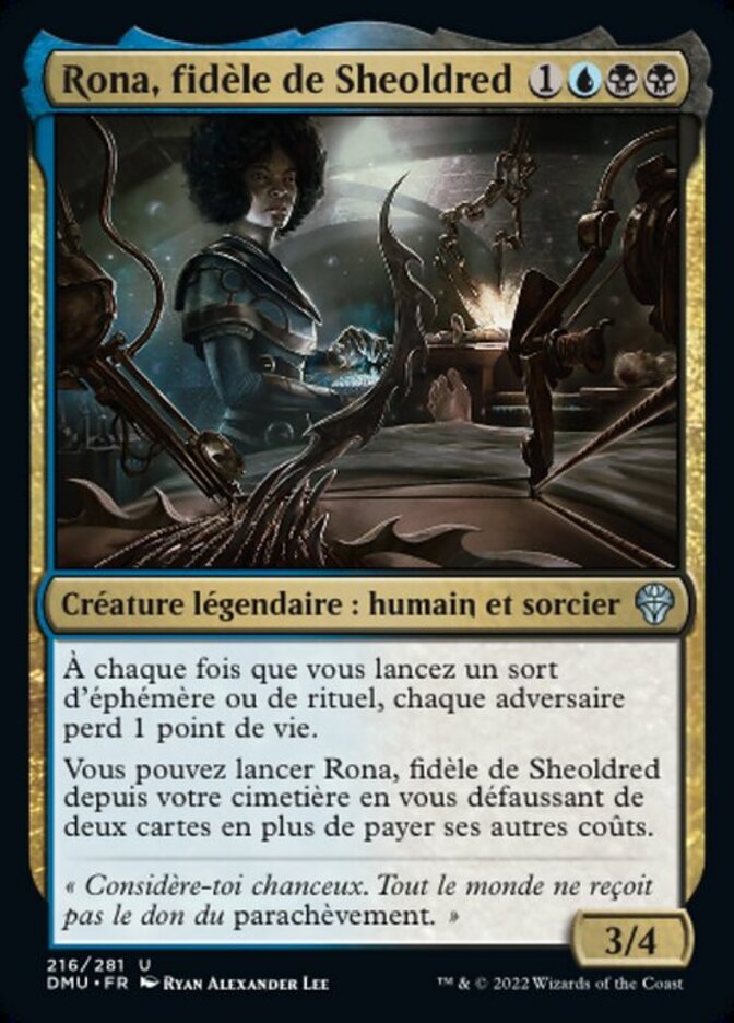 | Rules | Whenever you cast an instant or sorcery spell, each opponent loses 1 life. You may cast Rona, Sheoldred's Faithful from your graveyard by discarding two cards in addition to paying its other costs. |