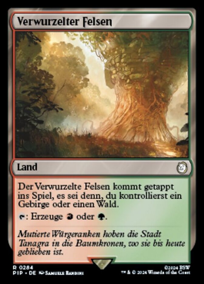 | Rules | Rootbound Crag enters the battlefield tapped unless you control a Mountain or a Forest. : Add or . |