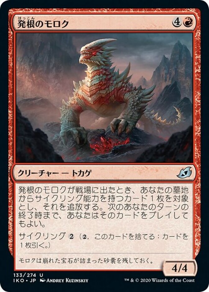 | Rules | When Rooting Moloch enters the battlefield, exile target card with a cycling ability from your graveyard. Until the end of your next turn, you may play that card. Cycling (, Discard this card: Draw a card.) |