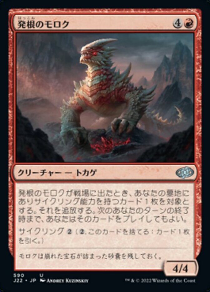 | Rules | When Rooting Moloch enters the battlefield, exile target card with a cycling ability from your graveyard. Until the end of your next turn, you may play that card. Cycling (, Discard this card: Draw a card.) |