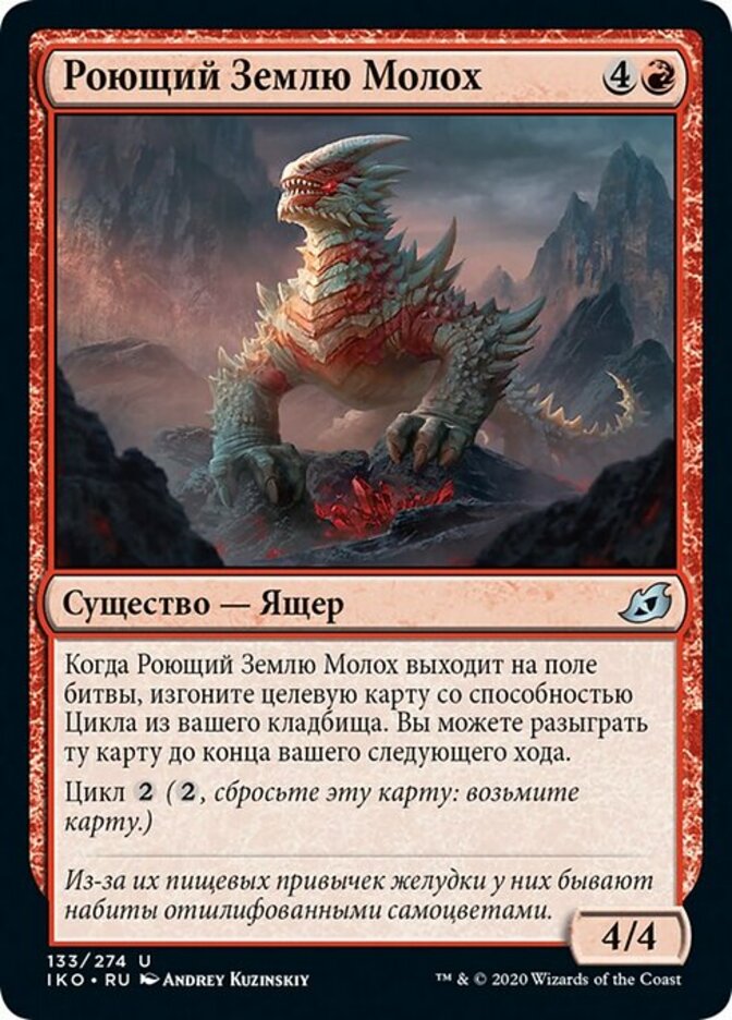 | Rules | When Rooting Moloch enters the battlefield, exile target card with a cycling ability from your graveyard. Until the end of your next turn, you may play that card. Cycling (, Discard this card: Draw a card.) |