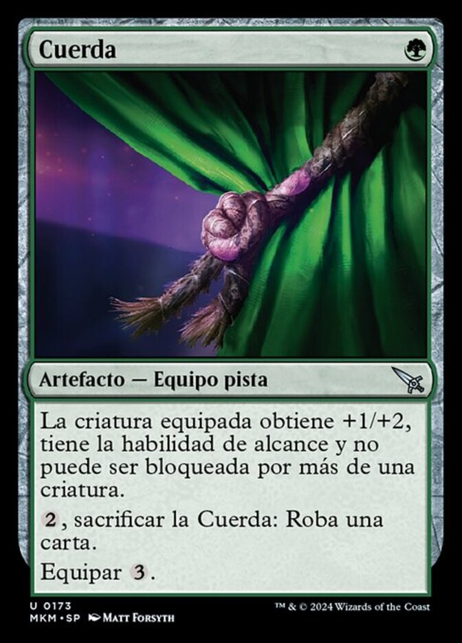 | Rules | Equipped creature gets +1/+2, has reach, and can't be blocked by more than one creature. , Sacrifice Rope: Draw a card. Equip |