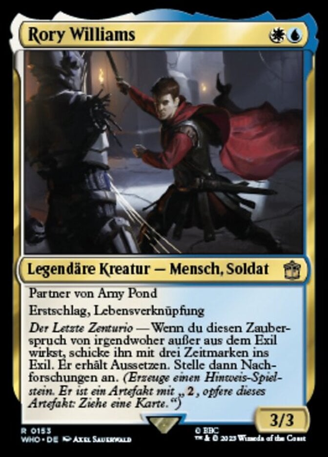 | Rules | Partner with Amy Pond First strike, lifelink The Last Centurion — When you cast this spell from anywhere other than exile, exile it with three time counters on it. It gains suspend. Then investigate. (Create a Clue token. It's an artifact with ", Sacrifice this artifact: Draw a card.") |
