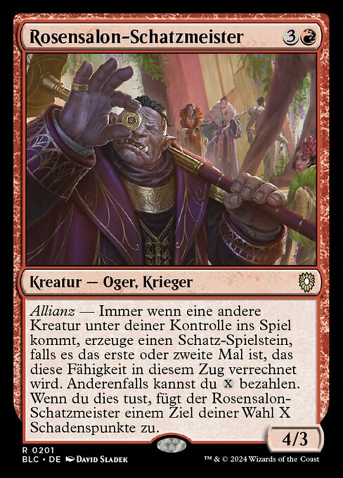 | Rules | Alliance — Whenever another creature enters the battlefield under your control, create a Treasure token if this is the first or second time this ability has resolved this turn. Otherwise, you may pay . When you do, Rose Room Treasurer deals X damage to any target. |
