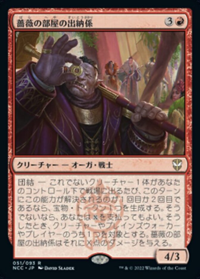 | Rules | Alliance — Whenever another creature enters the battlefield under your control, create a Treasure token if this is the first or second time this ability has resolved this turn. Otherwise, you may pay . When you do, Rose Room Treasurer deals X damage to any target. |