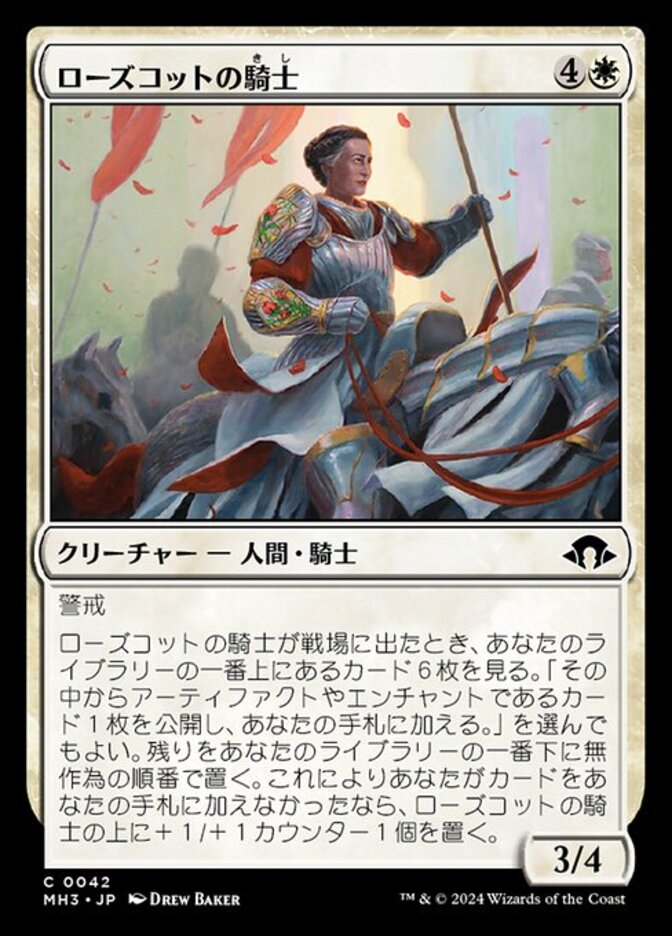 | Rules | Vigilance When Rosecot Knight enters the battlefield, look at the top six cards of your library. You may reveal an artifact or enchantment card from among them and put it into your hand. Put the rest on the bottom of your library in a random order. If you didn't put a card into your hand this way, put a +1/+1 counter on Rosecot Knight. |