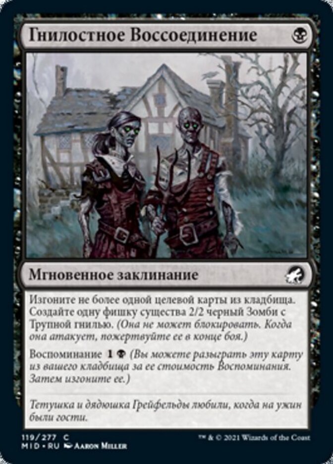 | Rules | Exile up to one target card from a graveyard. Create a 2/2 black Zombie creature token with decayed. (It can't block. When it attacks, sacrifice it at end of combat.) Flashback (You may cast this card from your graveyard for its flashback cost. Then exile it.) |