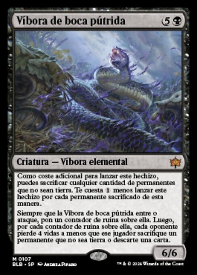 | Rules | As an additional cost to cast this spell, you may sacrifice any number of nonland permanents. This spell costs less to cast for each permanent sacrificed this way. Whenever Rottenmouth Viper enters or attacks, put a blight counter on it. Then for each blight counter on it, each opponent loses 4 life unless that player sacrifices a nonland permanent or discards a card. |