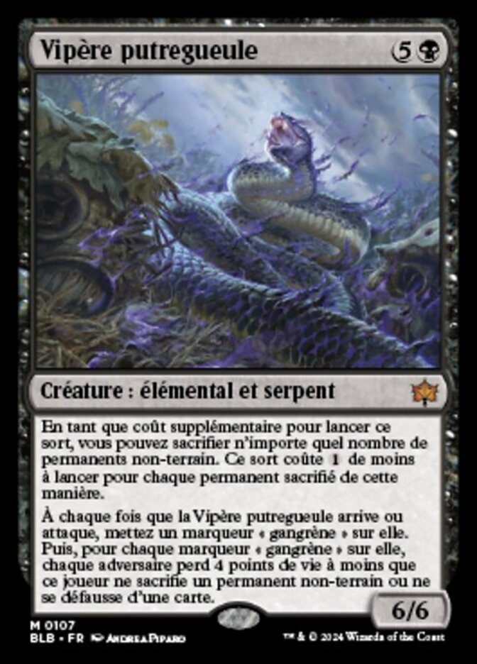 | Rules | As an additional cost to cast this spell, you may sacrifice any number of nonland permanents. This spell costs less to cast for each permanent sacrificed this way. Whenever Rottenmouth Viper enters or attacks, put a blight counter on it. Then for each blight counter on it, each opponent loses 4 life unless that player sacrifices a nonland permanent or discards a card. |