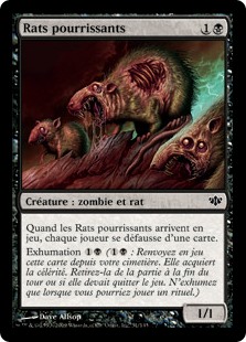 | Rules | When Rotting Rats enters the battlefield, each player discards a card. Unearth (: Return this card from your graveyard to the battlefield. It gains haste. Exile it at the beginning of the next end step or if it would leave the battlefield. Unearth only as a sorcery.) |