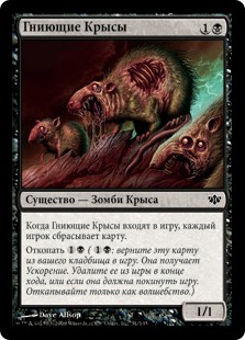 | Rules | When Rotting Rats enters the battlefield, each player discards a card. Unearth (: Return this card from your graveyard to the battlefield. It gains haste. Exile it at the beginning of the next end step or if it would leave the battlefield. Unearth only as a sorcery.) |