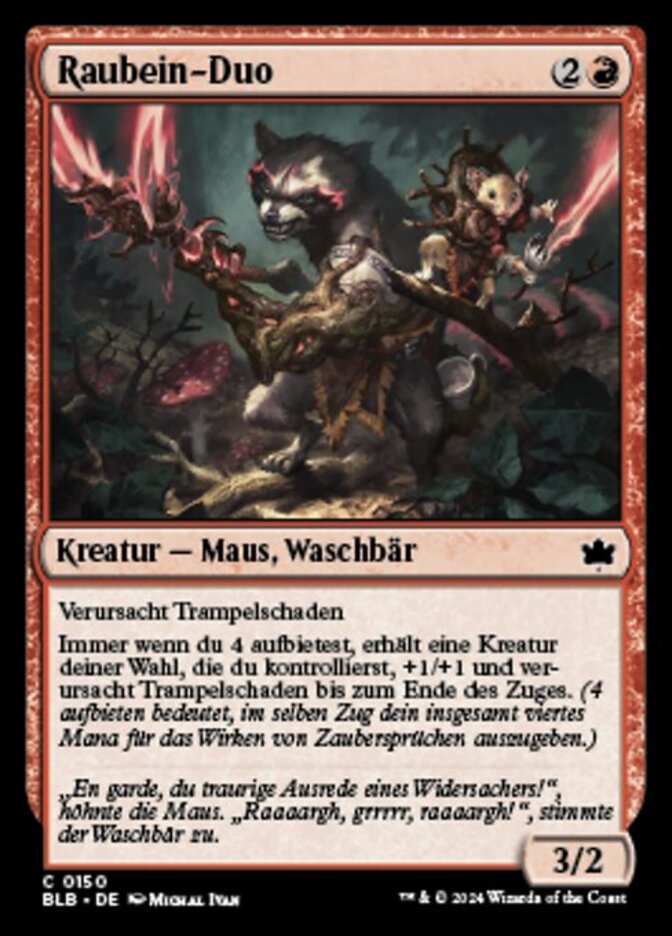 | Flavor | "En garde, inadequate excuse for a foe!" challenged the mouse. "Raaahrgh grrrr raaaargh!" agreed the raccoon. |