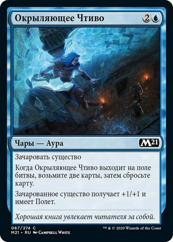 | Rules | Enchant creature When Rousing Read enters the battlefield, draw two cards, then discard a card. Enchanted creature gets +1/+1 and has flying. |