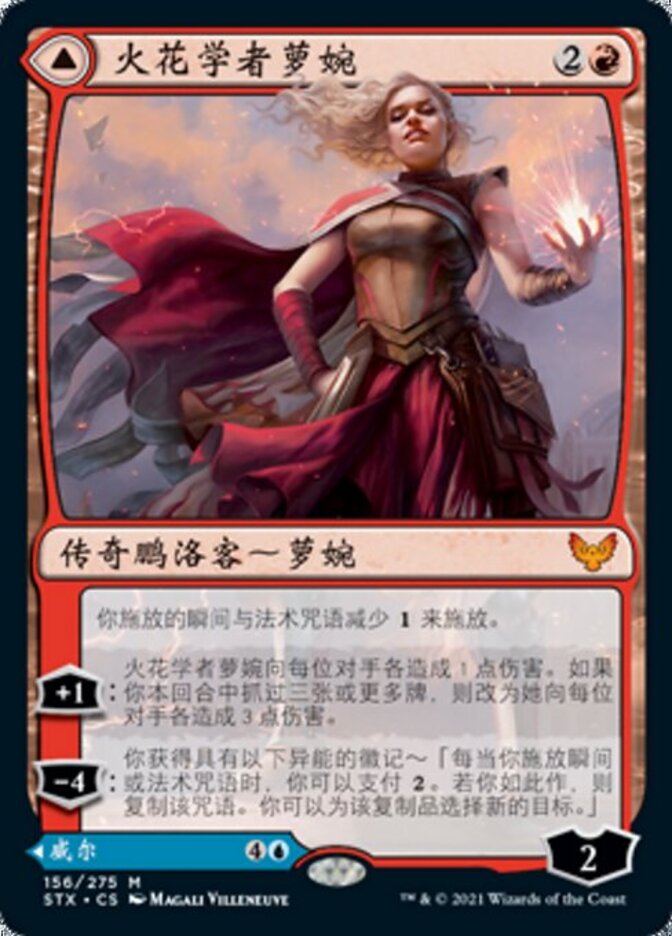 | Rules | Instant and sorcery spells you cast cost less to cast. +1: Rowan, Scholar of Sparks deals 1 damage to each opponent. If you've drawn three or more cards this turn, she deals 3 damage to each opponent instead. −4: You get an emblem with "Whenever you cast an instant or sorcery spell, you may pay . If you do, copy that spell. You may choose new targets for the copy." // Instant and sorcery spells you cast cost less to cast. +1: Up to one target creature has base power and toughness 0/2 until your next turn. −3: Draw two cards. −7: Exile up to five target permanents. For each permanent exiled this way, its controller creates a 4/4 blue and red Elemental creature token. |