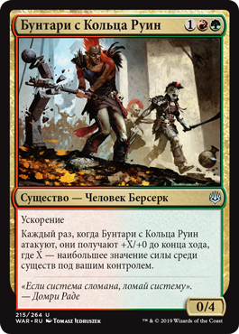 | Rules | Haste Whenever Rubblebelt Rioters attacks, it gets +X/+0 until end of turn, where X is the greatest power among creatures you control. |