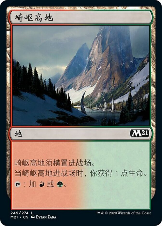 | Rules | Rugged Highlands enters the battlefield tapped. When Rugged Highlands enters the battlefield, you gain 1 life. : Add or . |