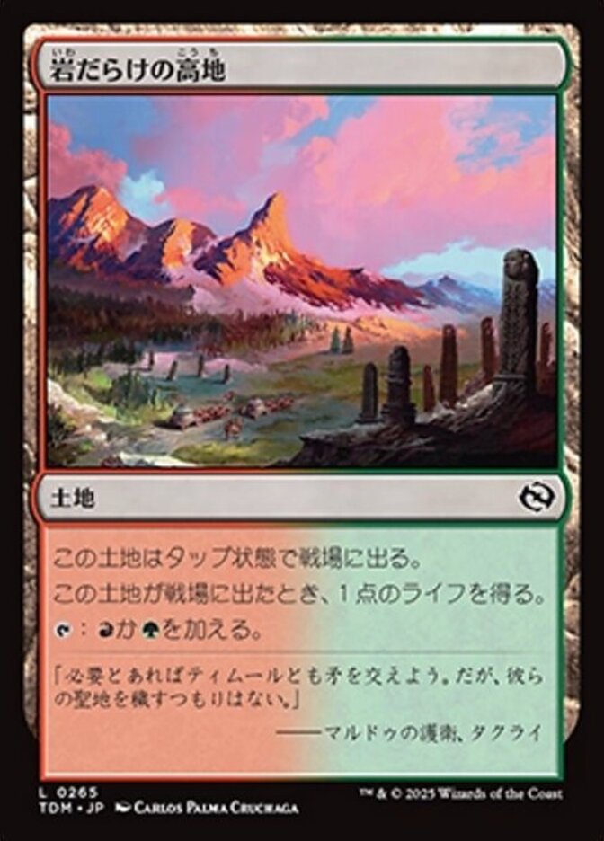 | Rules | Rugged Highlands enters the battlefield tapped. When Rugged Highlands enters the battlefield, you gain 1 life. : Add or . |
