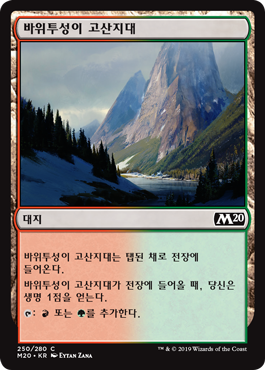 | Rules | Rugged Highlands enters the battlefield tapped. When Rugged Highlands enters the battlefield, you gain 1 life. : Add or . |