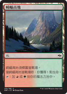 | Rules | Rugged Highlands enters the battlefield tapped. When Rugged Highlands enters the battlefield, you gain 1 life. : Add or . |