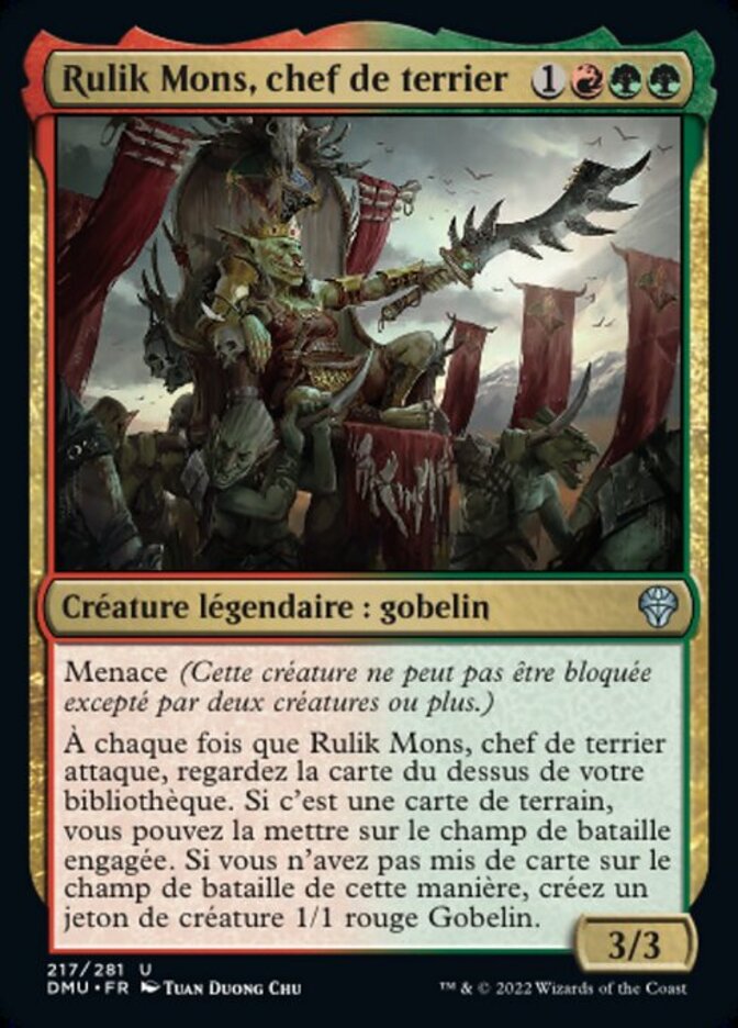 | Rules | Menace (This creature can't be blocked except by two or more creatures.) Whenever Rulik Mons, Warren Chief attacks, look at the top card of your library. If it's a land card, you may put it onto the battlefield tapped. If you didn't put a card onto the battlefield this way, create a 1/1 red Goblin creature token. |