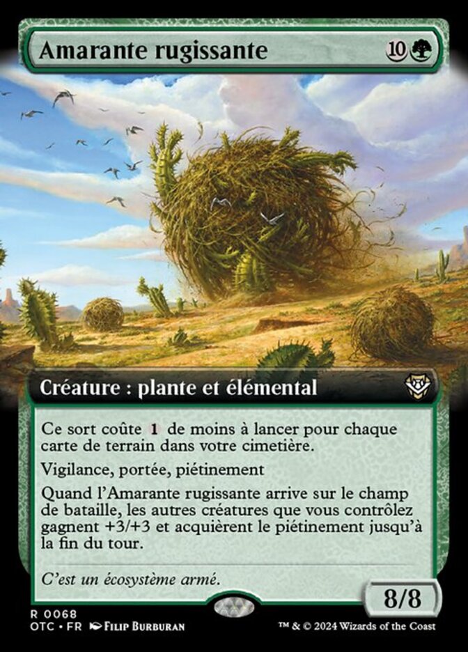| Rules | This spell costs less to cast for each land card in your graveyard. Vigilance, reach, trample When Rumbleweed enters the battlefield, other creatures you control get +3/+3 and gain trample until end of turn. |