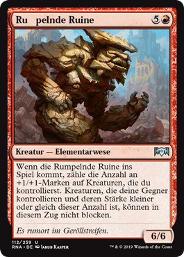 | Rules | When Rumbling Ruin enters the battlefield, count the number of +1/+1 counters on creatures you control. Creatures your opponents control with power less than or equal to that number can't block this turn. |