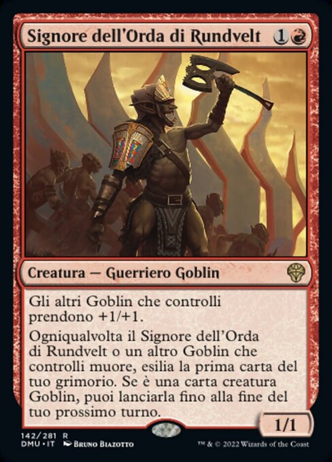 | Rules | Other Goblins you control get +1/+1. Whenever Rundvelt Hordemaster or another Goblin you control dies, exile the top card of your library. If it's a Goblin creature card, you may cast that card until the end of your next turn. |