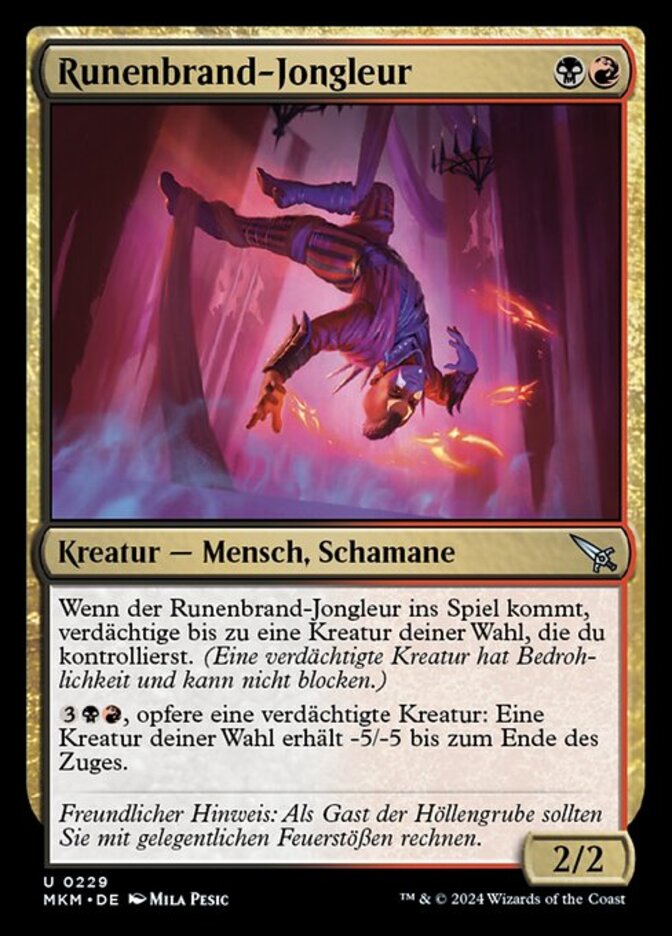 | Rules | When Rune-Brand Juggler enters the battlefield, suspect up to one target creature you control. (A suspected creature has menace and can't block.) , Sacrifice a suspected creature: Target creature gets -5/-5 until end of turn. |