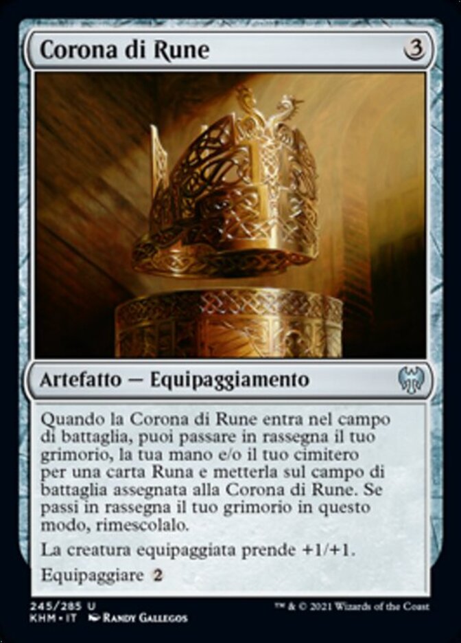 | Rules | When Runed Crown enters the battlefield, you may search your library, hand, and/or graveyard for a Rune card and put it onto the battlefield attached to Runed Crown. If you search your library this way, shuffle. Equipped creature gets +1/+1. Equip |