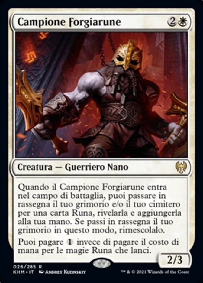 | Rules | When Runeforge Champion enters the battlefield, you may search your library and/or graveyard for a Rune card, reveal it, and put it into your hand. If you search your library this way, shuffle. You may pay rather than pay the mana cost for Rune spells you cast. |