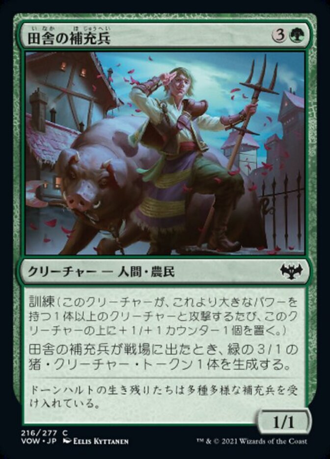 | Rules | Training (Whenever this creature attacks with another creature with greater power, put a +1/+1 counter on this creature.) When Rural Recruit enters the battlefield, create a 3/1 green Boar creature token. |