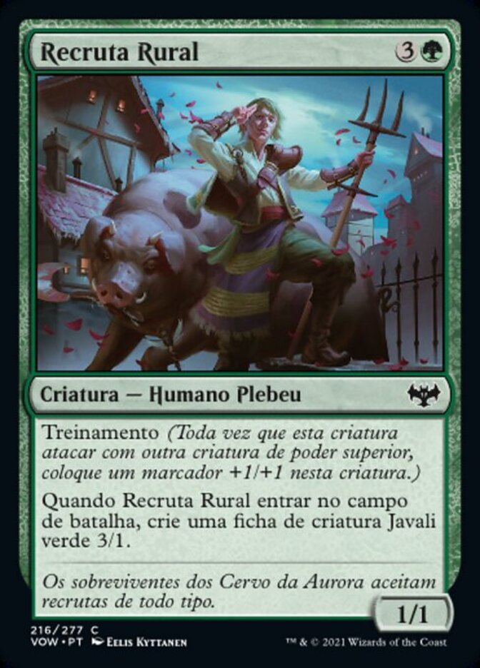 | Rules | Training (Whenever this creature attacks with another creature with greater power, put a +1/+1 counter on this creature.) When Rural Recruit enters the battlefield, create a 3/1 green Boar creature token. |