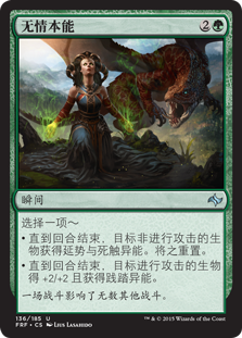 | Rules | Choose one — • Target nonattacking creature gains reach and deathtouch until end of turn. Untap it. • Target attacking creature gets +2/+2 and gains trample until end of turn. |