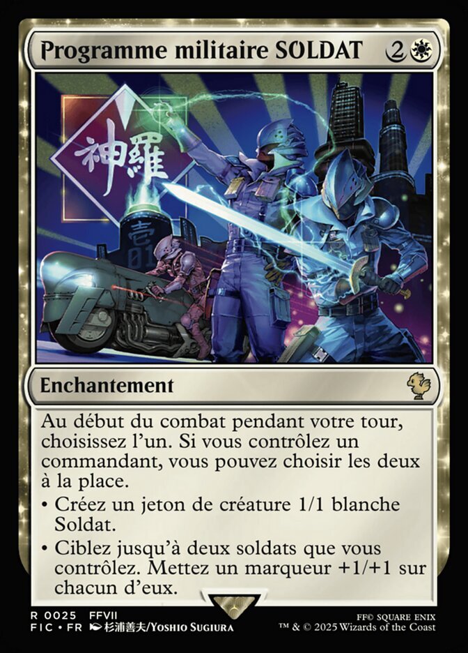 | Rules | At the beginning of combat on your turn, choose one. If you control a commander, you may choose both instead. • Create a 1/1 white Soldier creature token. • Put a +1/+1 counter on each of up to two Soldiers you control. |